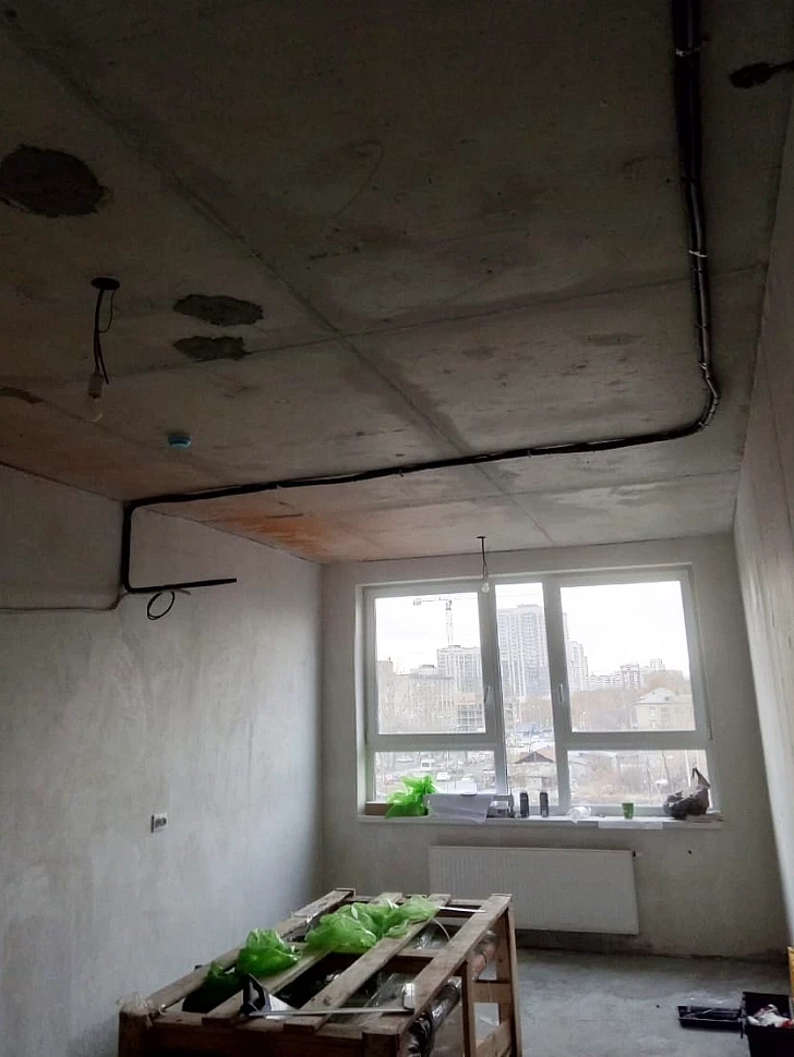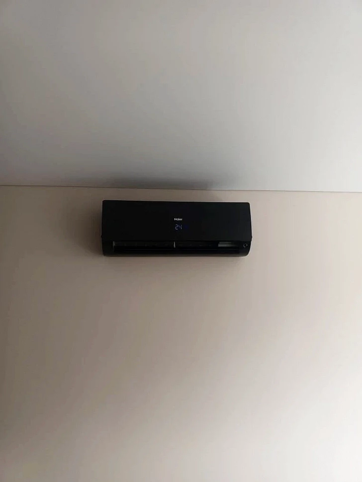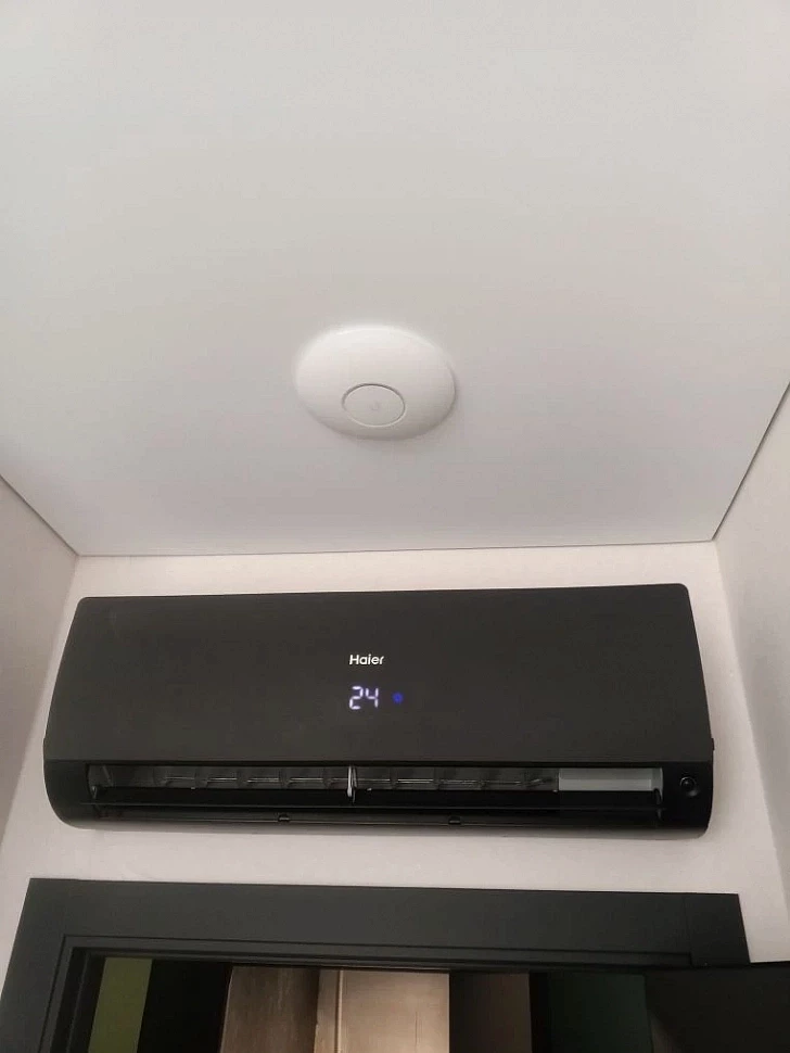 Установка мульти-сплит-системы производилась поэтапно. На первом этапе (2024 г.) были заложены все трассы коммуникаций: часть скрыто в штробах, часть — в межпотолочном пространстве за натяжным полотном. Второй этап реализован после окончания ремонтно-отделочных работ. На финише выполнены монтаж внутренних и наружного блоков, подключение к магистралям, вакуумирование, запуск и проверка работы системы в штатных режимах.