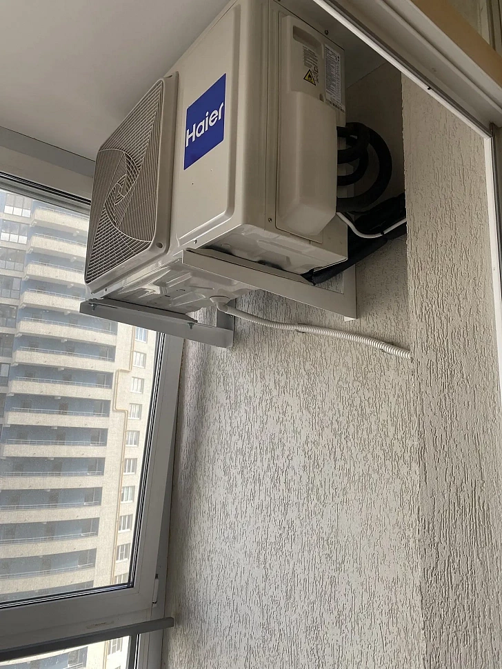 Решение: Мульти-сплит-система Haier: наружный блок общей мощностью 5 кВт и два внутренних блока мощностью 2,6 кВт каждый. Установка наружного блока на лоджии.