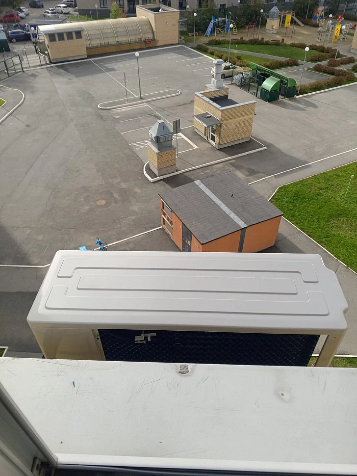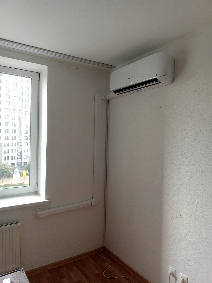 Кондиционер установлен в 1 этап, на готовый ремонт. Фреоновый трубопровод проходит внутри помещения, закрыт декоративным кабель-каналом. Наружный блок установлен под открывающейся створкой окна.