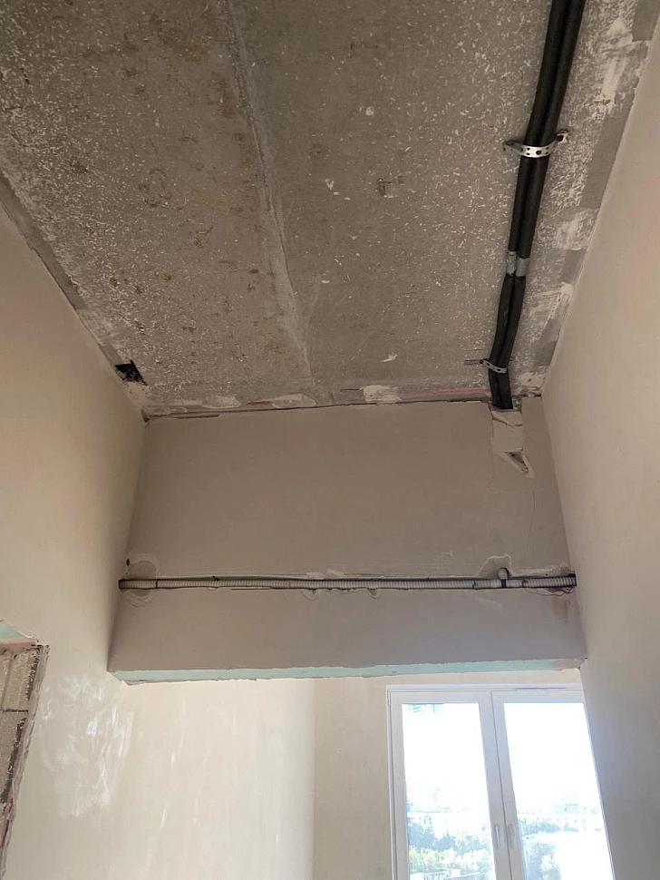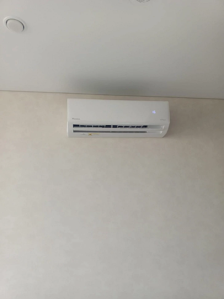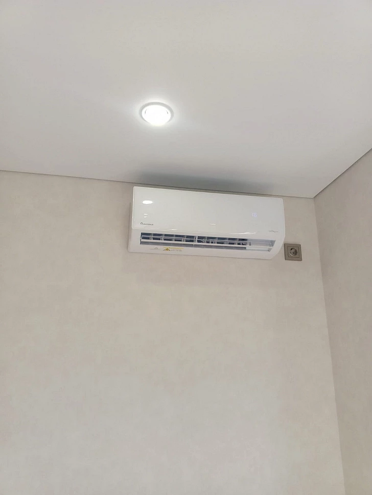 Установка этой сплит-системы проходила в 2 этапа, с закладкой трасс на стадии ремонта помещения и установкой и подключением через несколько месяцев, уже после полного окончания ремонта. Трубопровод проложен за натяжным потолком и частично в штробе. Наружный блок установлен на специальную подставку, на открытой части балкона.